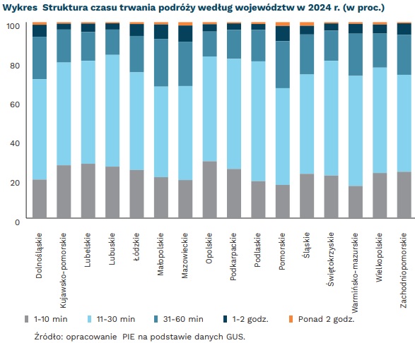 Analiza GUS pokazuje, że struktura czasu trwania podróży różni się w zależności od województwa. Najwięcej bardzo krótkich podróży – do 10 minut – odbywa się w regionach o mniejszej gęstości zaludnienia i słabszej urbanizacji, takich jak lubuskie, świętokrzyskie czy podlaskie. W dużych województwach – mazowieckim, małopolskim, śląskim i wielkopolskim – przeważają przejazdy trwające od 31 do 60 minut.