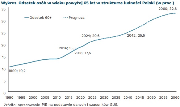 Według danych Głównego Urzędu Statystycznego, w 2014 r. osoby powyżej 65. roku życia stanowiły 15,3 proc. populacji, a w 2024 r. już 20,6 proc. Prognozy wskazują, że w 2060 r. niemal co trzeci mieszkaniec Polski będzie miał więcej niż 65 lat. Dla porównania, w 2024 r. najwyższy odsetek seniorów wśród państw UE odnotowano we Włoszech (24,3 proc.) i Portugalii (24,1 proc.), a najniższy w Luksemburgu (15 proc.) i Irlandii (15,5 proc.).