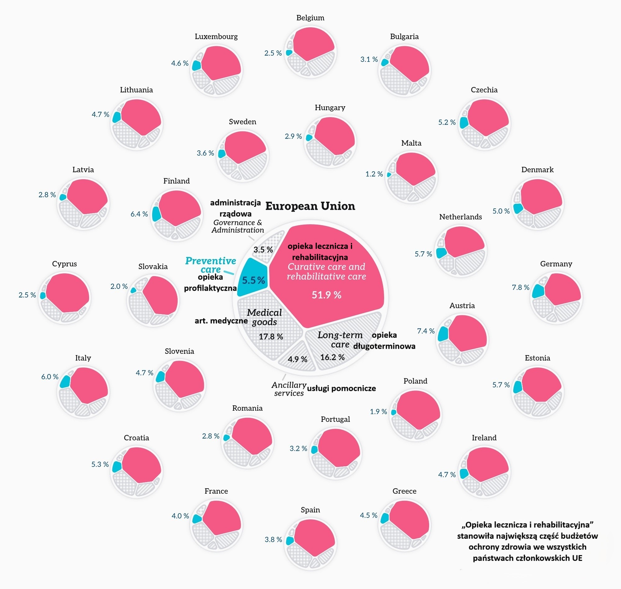 W 2022 roku usługi profilaktyczne stanowiły średnio 5,5% całkowitych wydatków na zdrowie w UE. Największy udział miały: opieka lecznicza i rehabilitacyjna (51,9%), leki i produkty medyczne (17,8%) oraz opieka długoterminowa (16,2%).
