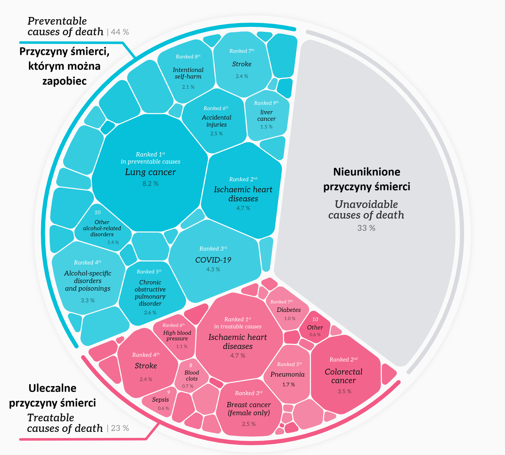Tylko jedna trzecia tych zgonów (33%) była nieunikniona – związana z chorobami, których medycyna w obecnym stanie nie potrafi zatrzymać. Natomiast 44% zgonów wynikało z przyczyn możliwych do zapobieżenia, takich jak palenie tytoniu, nadużywanie alkoholu czy ekspozycja na zanieczyszczenia. Kolejne 23% można było leczyć, gdyby pacjenci mieli szybszy i skuteczniejszy dostęp do opieki medycznej.