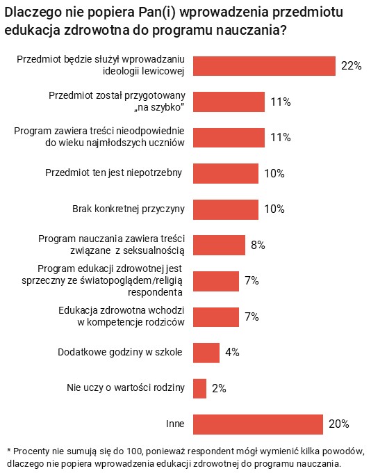 Wśród osób sprzeciwiających się edukacji zdrowotnej, najczęściej pojawiającym się argumentem jest obawa przed ideologicznym charakterem zajęć – taką opinię wyraża 22 proc. przeciwników. Uważają oni, że przedmiot może być wykorzystywany do promowania poglądów politycznych lub światopoglądowych, zwłaszcza o orientacji lewicowej.