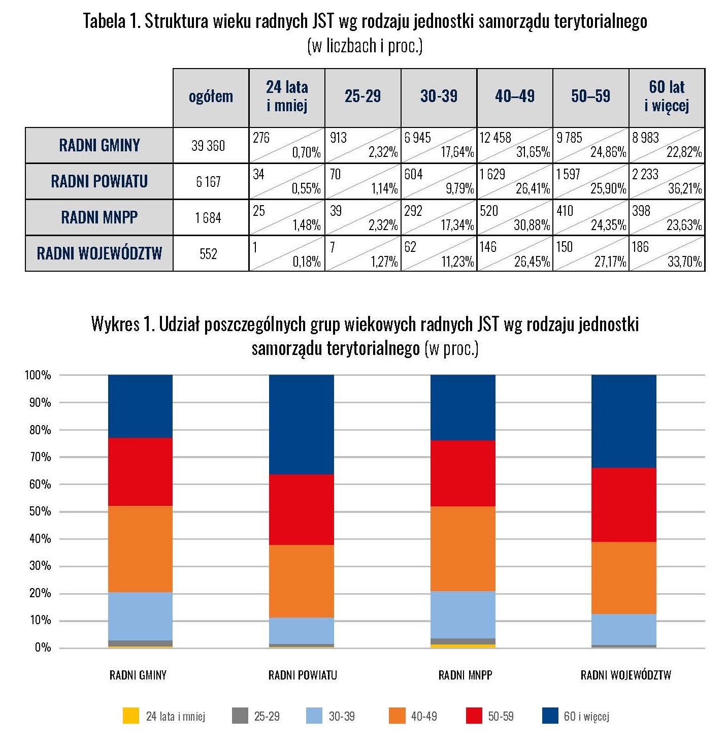 Dominują osoby w wieku od 40 do 59 lat. To właśnie to pokolenie – zawodowo ustabilizowane, życiowo ukształtowane – stanowi trzon lokalnej władzy. W każdej kategorii samorządu, od gmin po sejmiki województw, ta grupa tworzy ponad połowę składu rad.