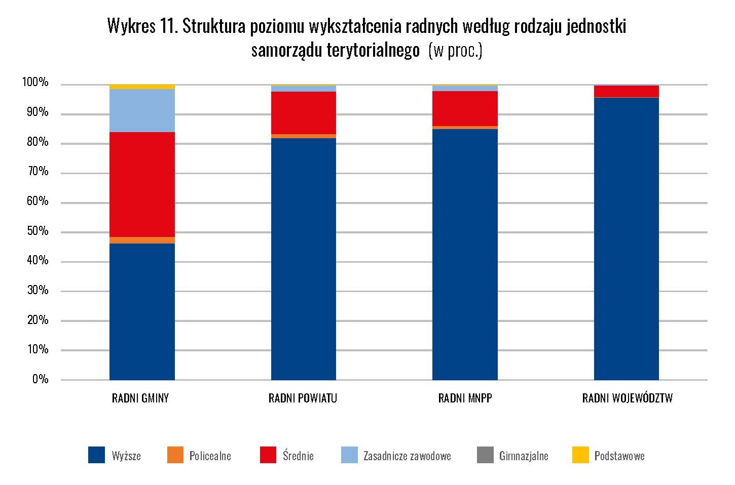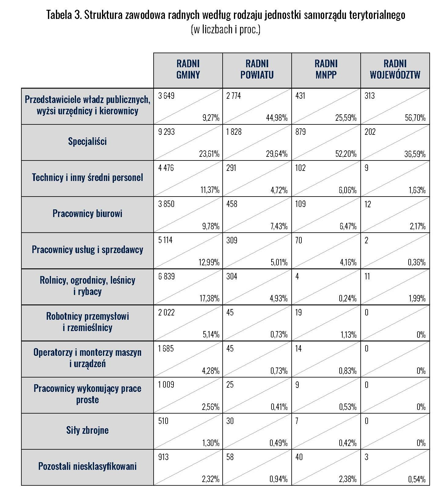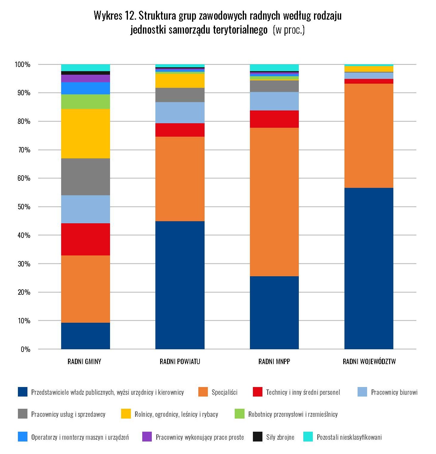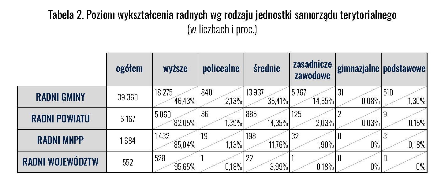 Najliczniejszą grupą wśród radnych są specjaliści – osoby z wyższym wykształceniem, często pracujące w zawodach wymagających kwalifikacji akademickich. W miastach na prawach powiatu stanowią już ponad połowę składu rad.