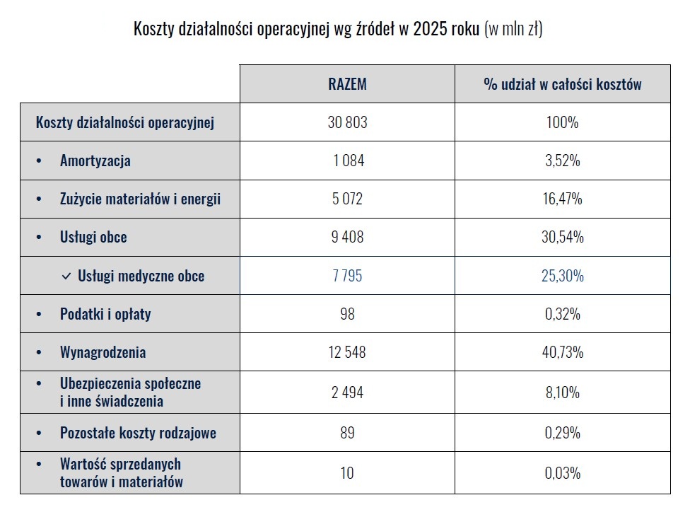 W 2025 roku całkowite koszty działalności operacyjnej szpitali powiatowych przekroczyły 30,8 mld zł. Największą część stanowiły wynagrodzenia (ponad 40% kosztów) oraz usługi obce (ponad 30%).