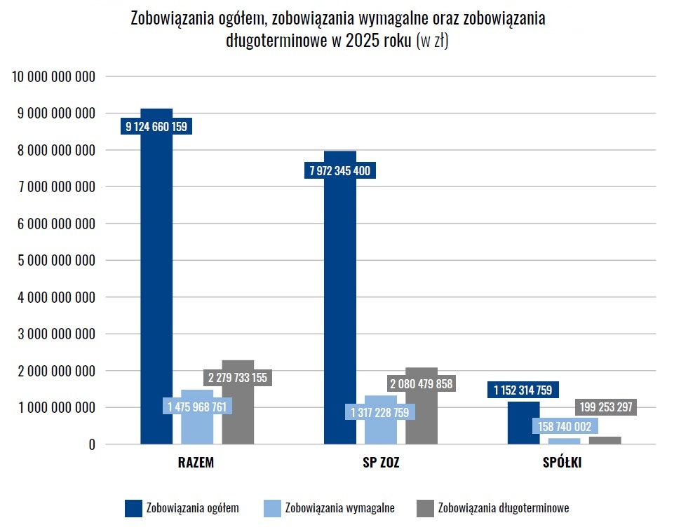 Brak równowagi finansowej przekłada się bezpośrednio na wzrost zadłużenia. Łączne zobowiązania szpitali przekroczyły 9,1 mld zł, z czego niemal 1,48 mld zł stanowią zobowiązania wymagalne – czyli takie, których termin spłaty już minął.