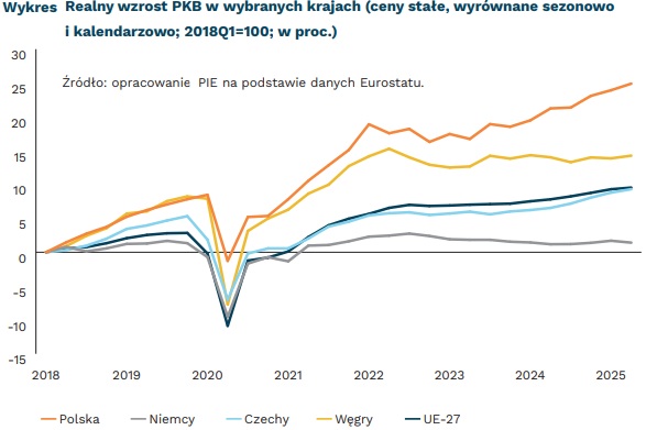Od pierwszego kwartału 2018 r. do drugiego kwartału 2025 r. polski produkt krajowy brutto wzrósł realnie o około 24,9 proc. To jeden z najlepszych wyników w całej Unii Europejskiej. Dla porównania, w Niemczech wzrost w tym samym okresie wyniósł zaledwie 1,4 proc., a w Czechach i na Węgrzech – około 9–10 proc. Oznacza to, że polska gospodarka rosła ponad dwukrotnie szybciej niż średnia unijna, stając się regionalnym liderem tempa rozwoju.